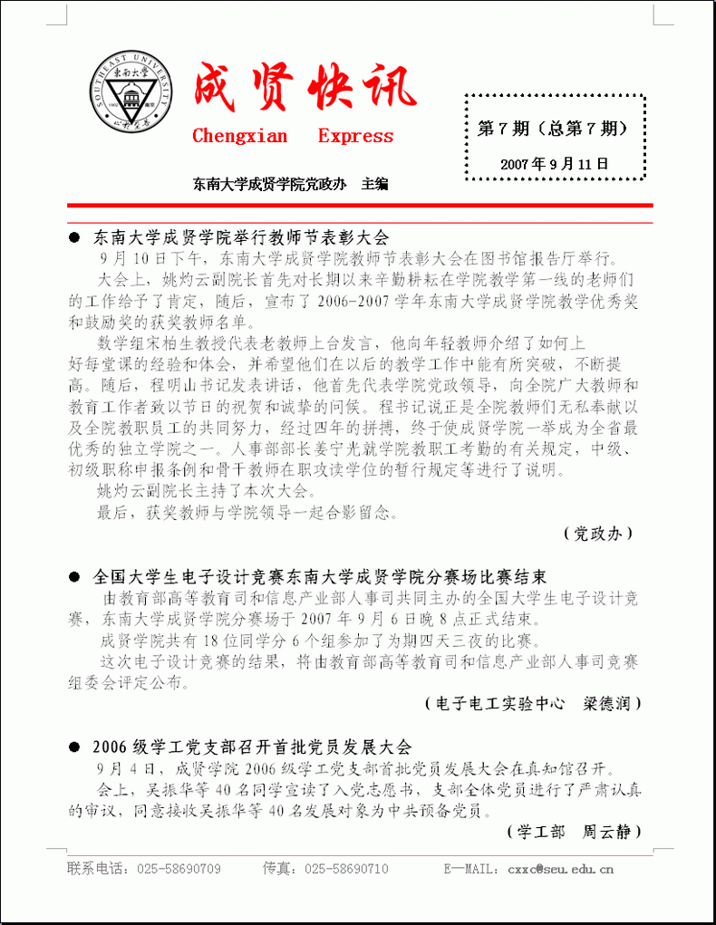 成贤快讯 第07期(总第07期) 2007年09月11日