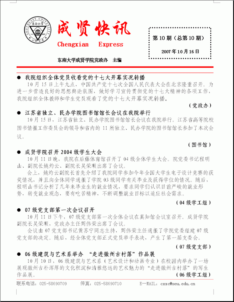 成贤快讯 第10期(总第10期) 2007年10月16日