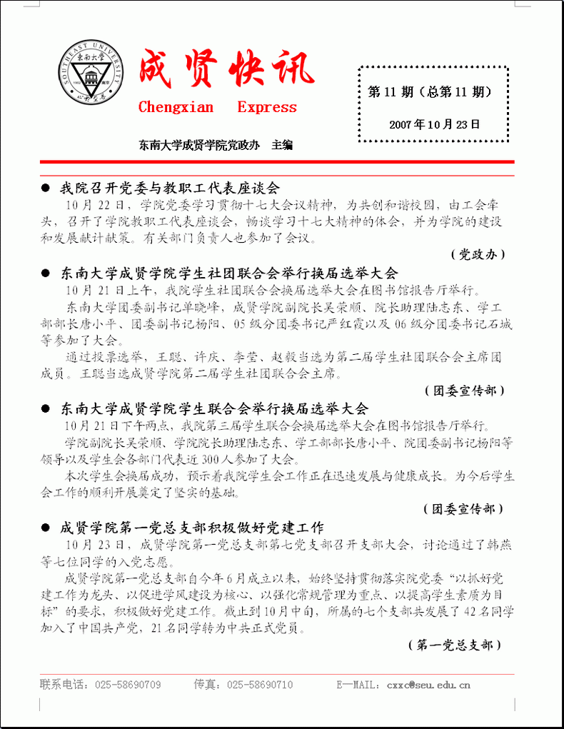 成贤快讯 第11期(总第11期) 2007年10月23日