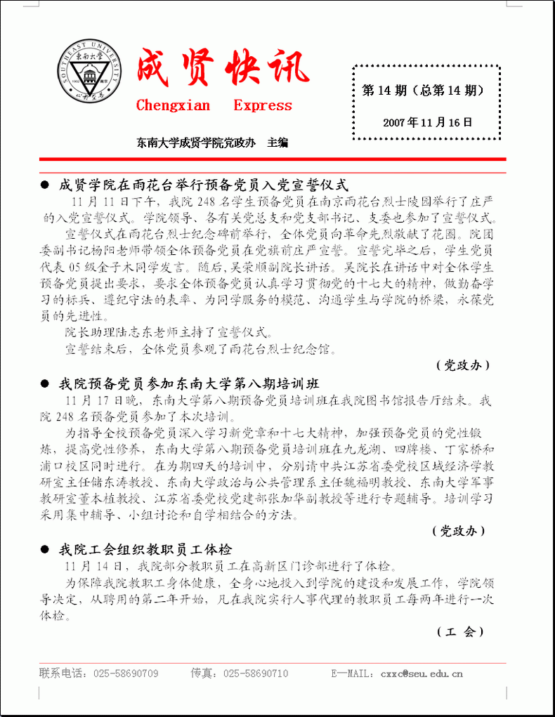 成贤快讯 第14期(总第14期) 2007年11月16日