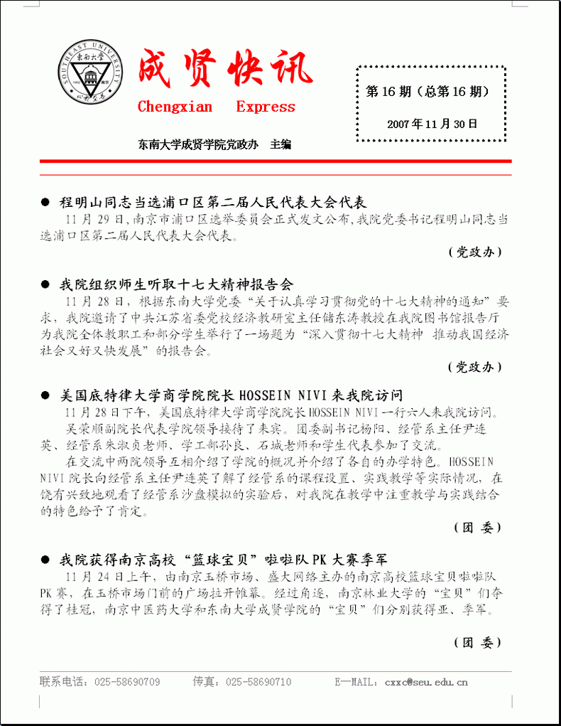 成贤快讯 第16期(总第16期) 2007年11月30日