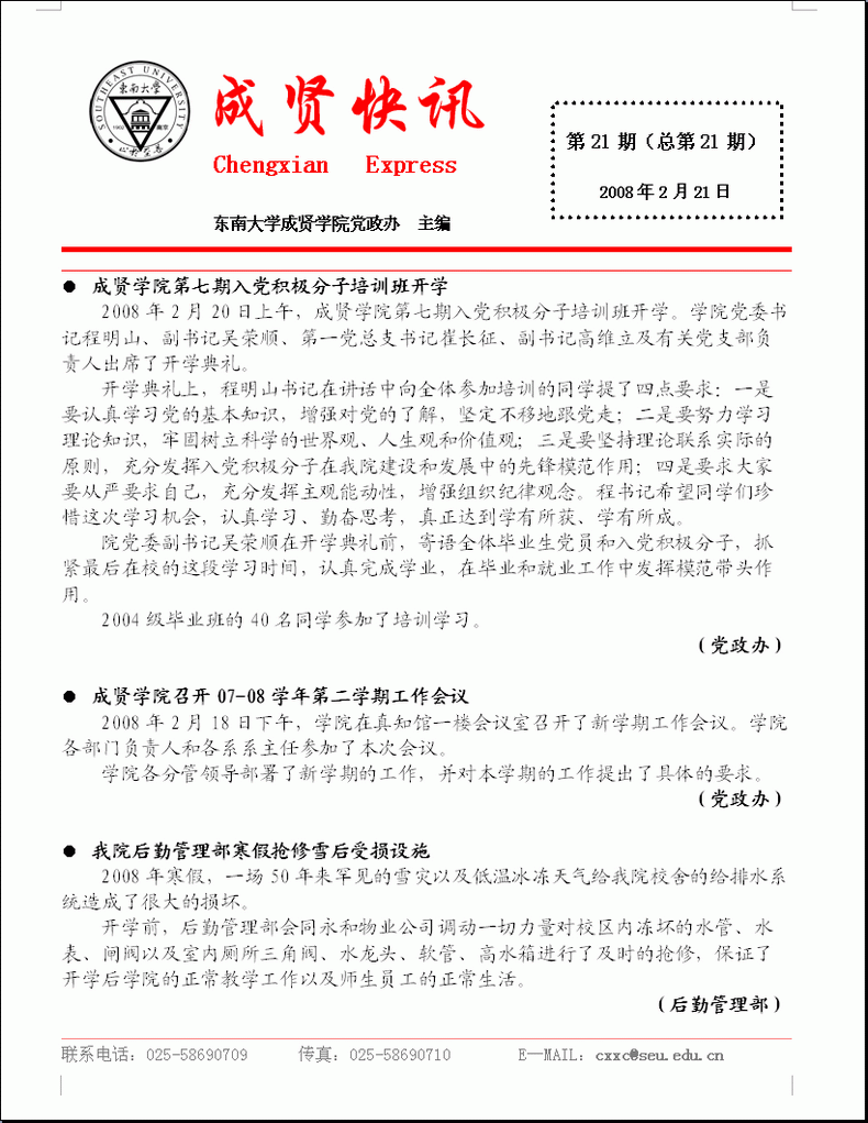 成贤快讯 第21期(总第21期) 2008年02月21日