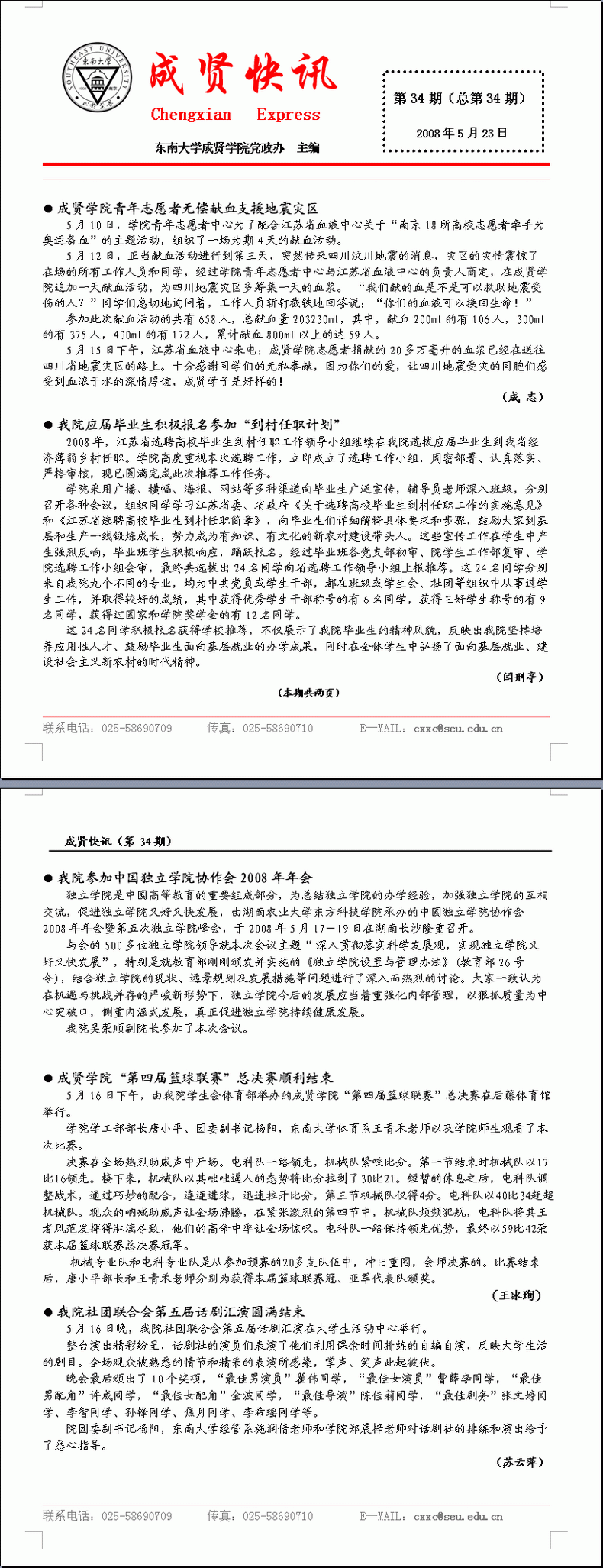 成贤快讯 第34期(总第34期) 2008年05月23日
