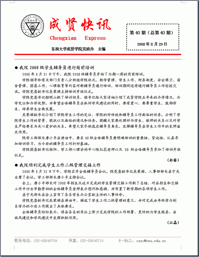 成贤快讯 第40期(总第40期) 2008年08月29日