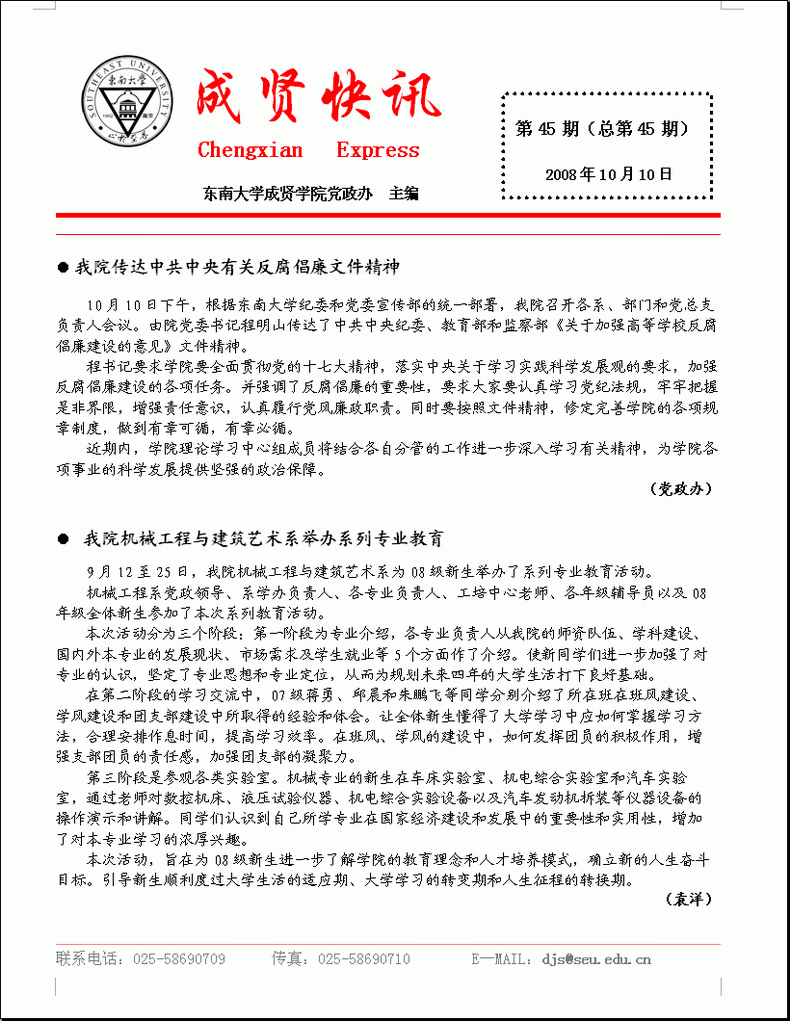 成贤快讯 第45期(总第45期) 2008年10月10日
