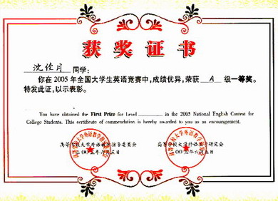 非英语专业沈佳月同学在2005年全国大学生英语竞赛中取得好成绩