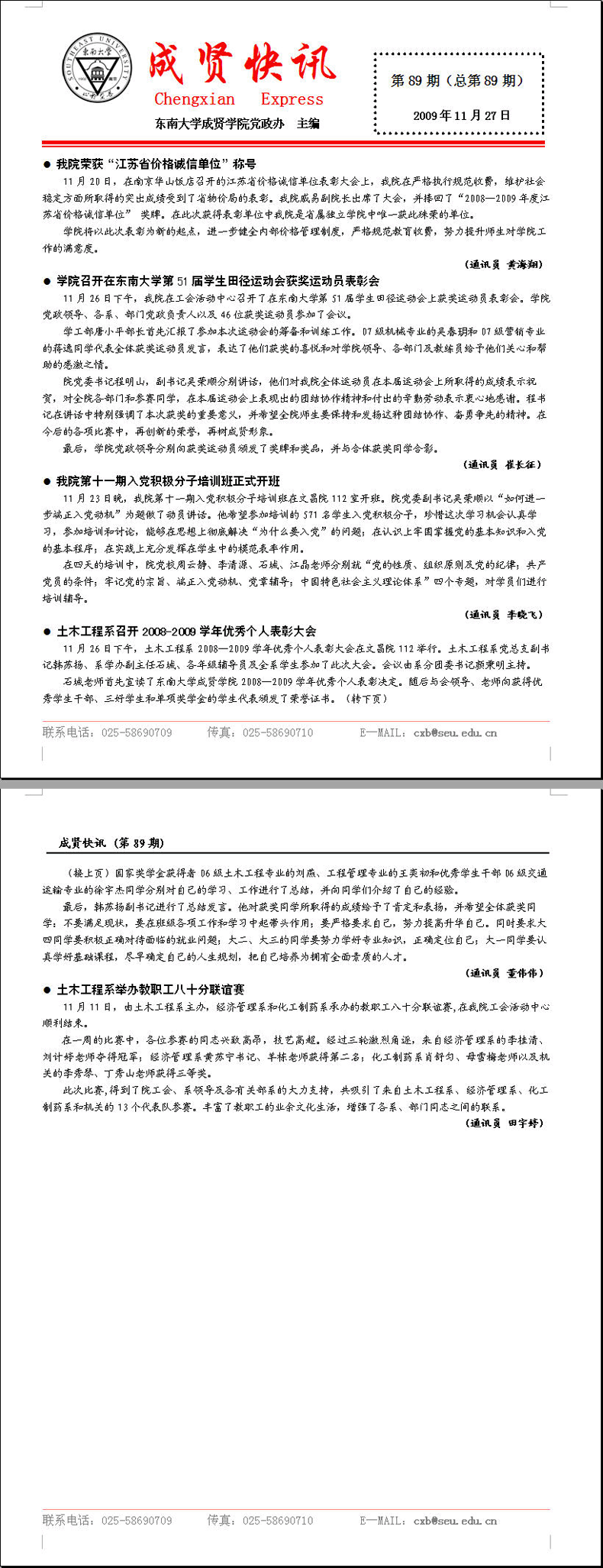成贤快讯 第89期(总第89期) 2009年11月27日