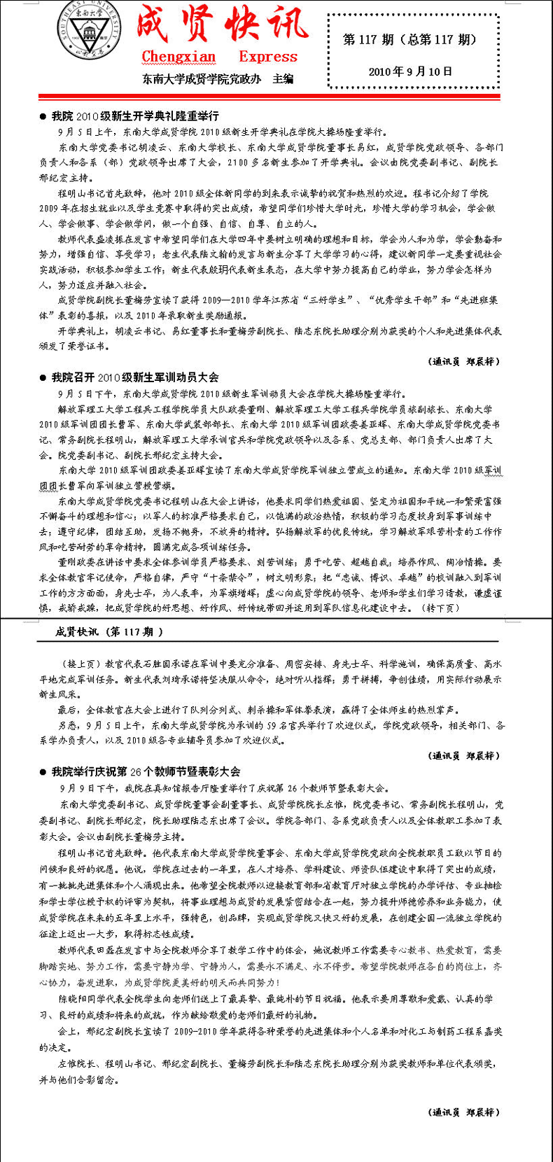 成贤快讯 第117期(总第117期) 2010年09月10日