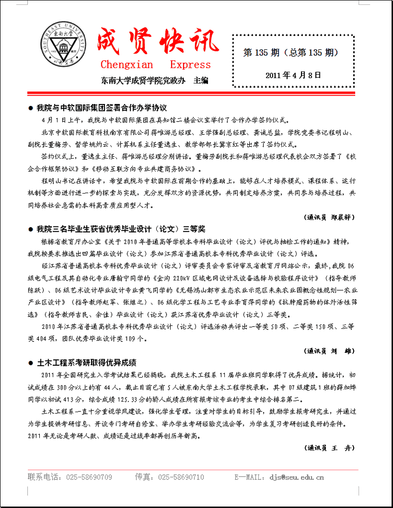 成贤快讯 第135期(总第135期) 2011年04月08日