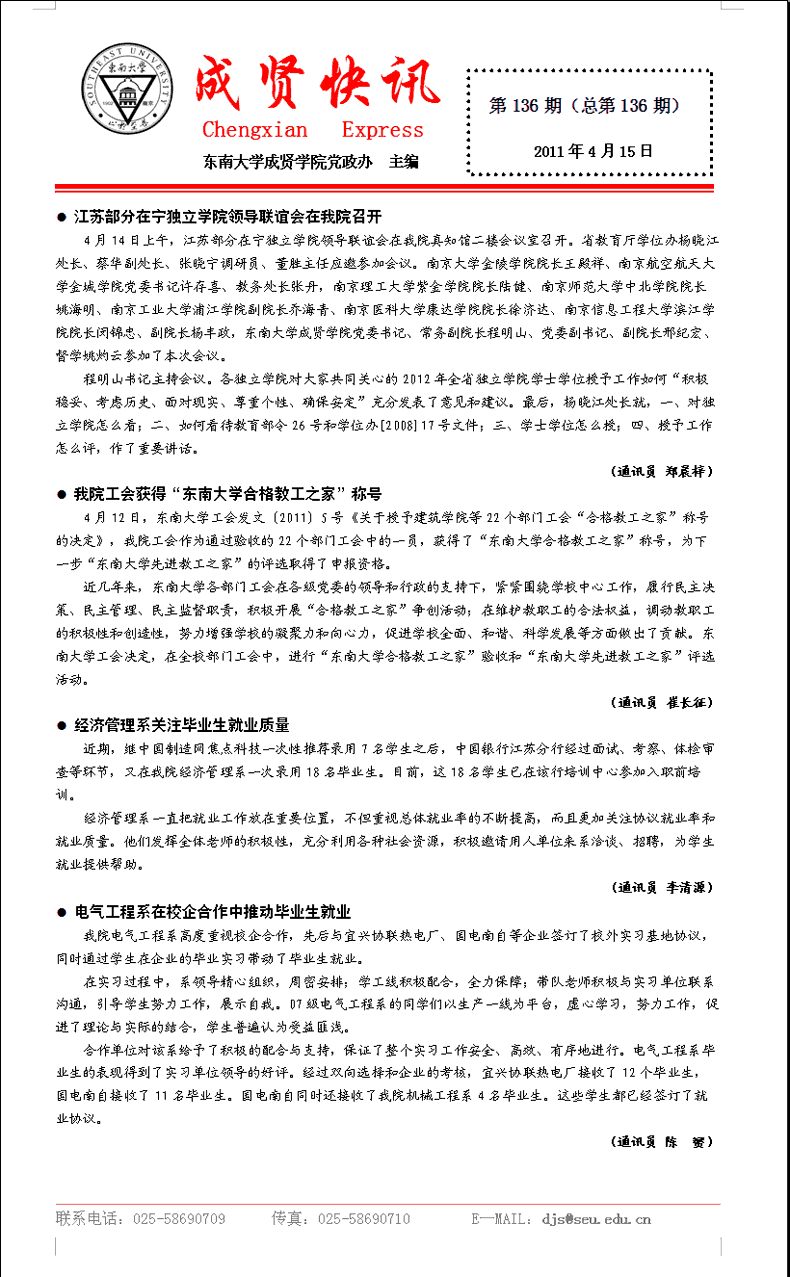 成贤快讯 第136期(总第136期) 2011年04月15日