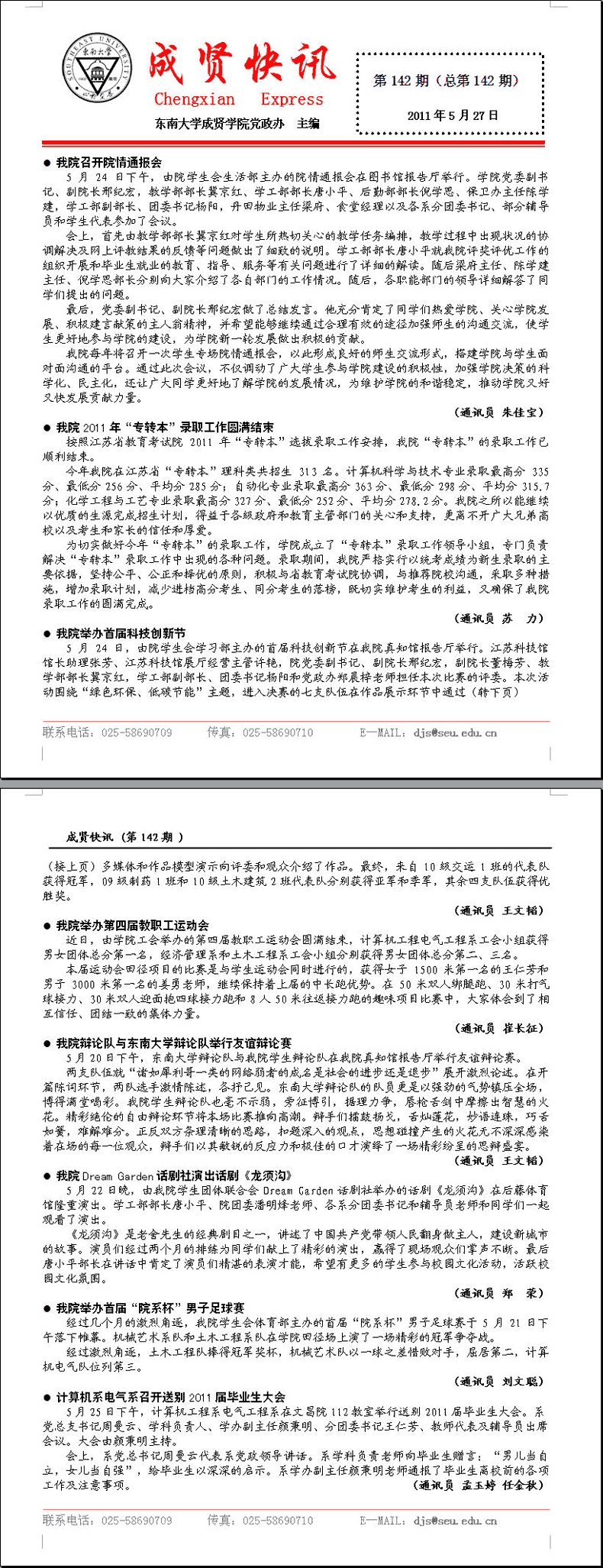 成贤快讯 第142期(总第142期) 2011年05月27日