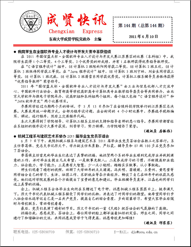 成贤快讯 第144期(总第144期) 2011年06月10日