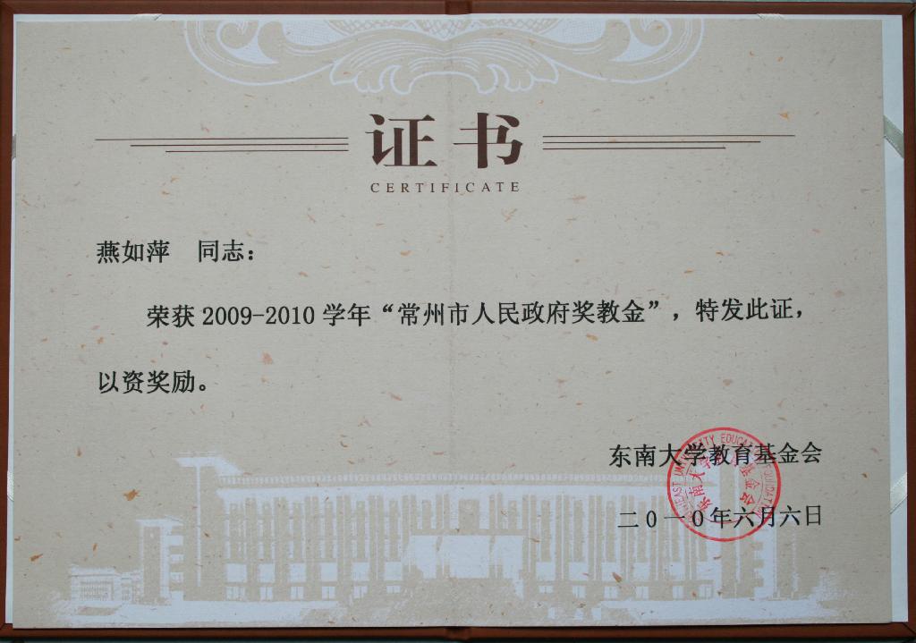 2010年燕如萍老师获常州市人民政府奖教金