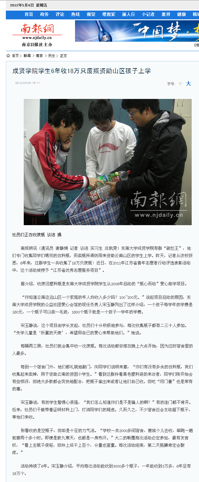 【南报网】云鼎国际4118welcome学生6年收18万只废瓶资助山区孩子上学