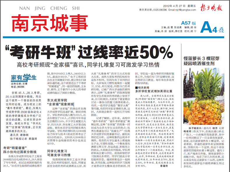 扬子晚报专版报道我院考研佳绩