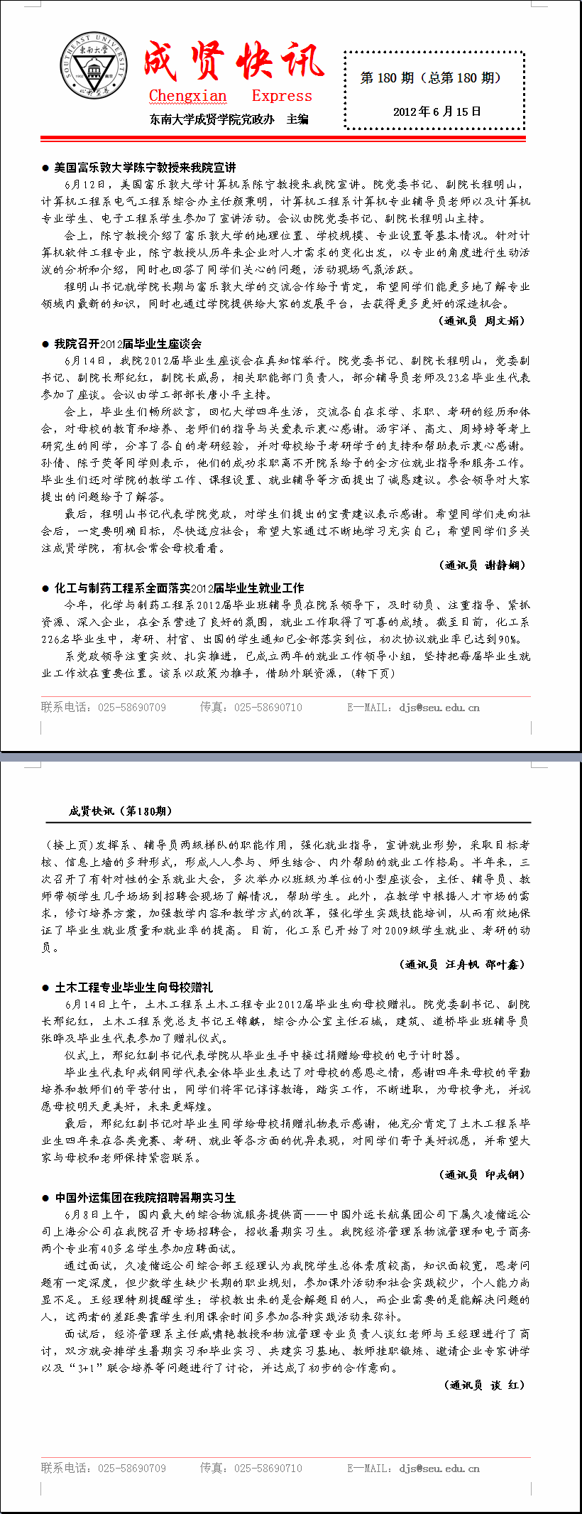 成贤快讯 第180期(总第180期) 2012年06月15日