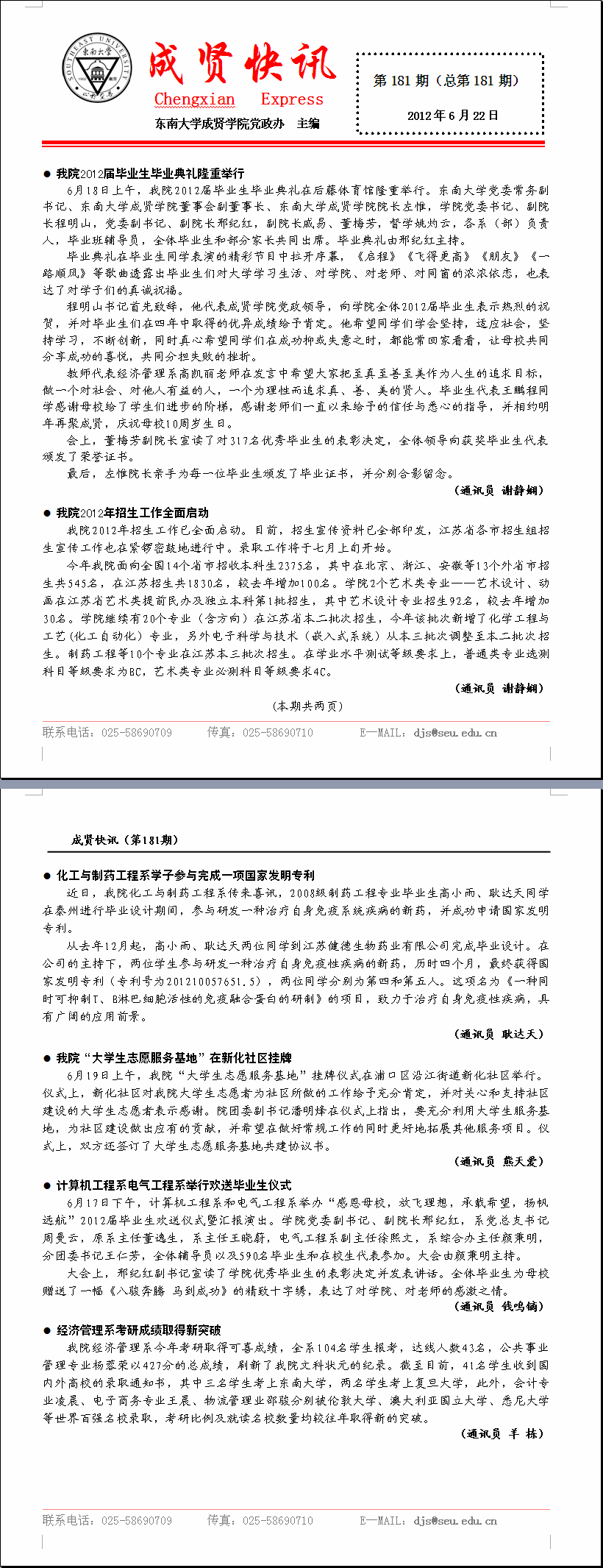 成贤快讯 第181期(总第181期) 2012年06月22日