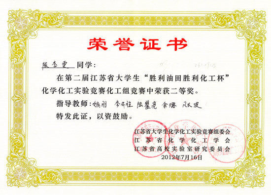 2012第二届江苏省大学生“化工杯”化学化工实验竞赛获奖证书