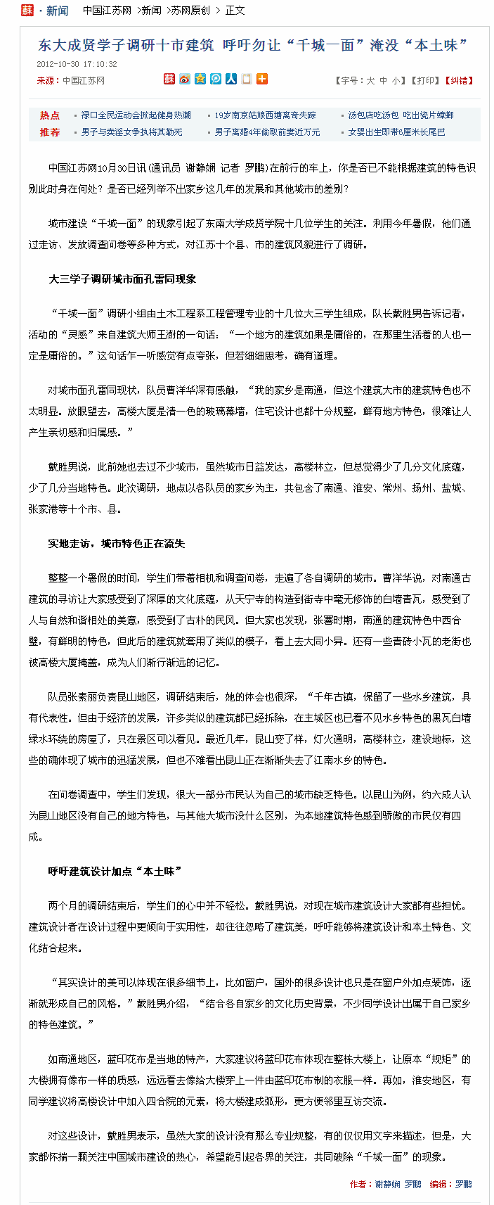 【中国江苏网】东大成贤学子调研十市建筑 呼吁勿让“千城一面”淹没“本土味”