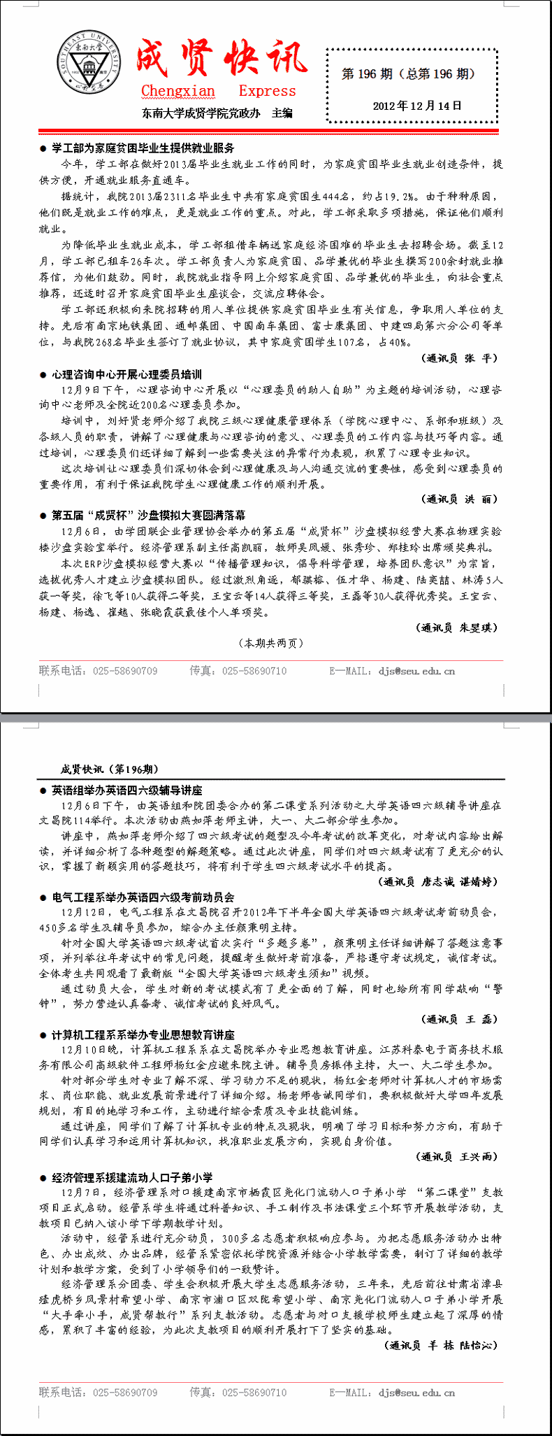 成贤快讯 第196期(总第196期) 2012年12月14日