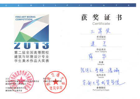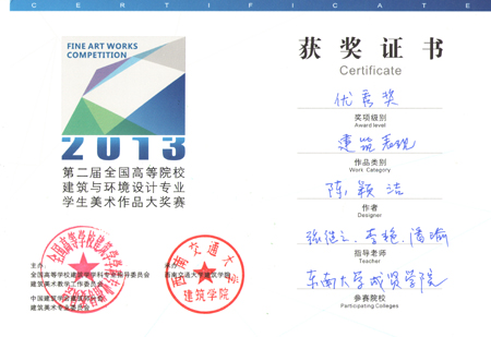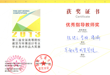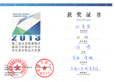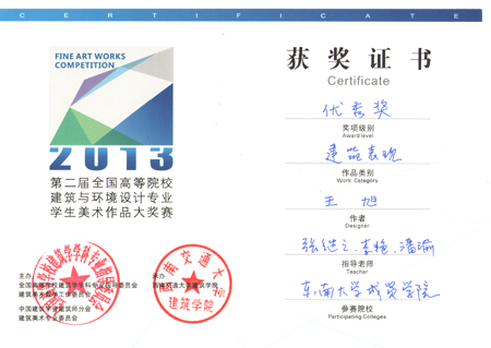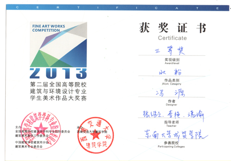 我院建筑与艺术系学生在2013年第二届全国高等院校建筑与环境设计专业学生美术作品大赛中获得佳绩。其中,2010级艺术设计1班冯源的水粉作品和2009级艺术设计2班薛华的速写作品获得三等奖,陈颖洁、王旭、冯源等3名学生的建筑表现、水粉系列作品获得了优秀奖。建筑与艺术系张继之、李艳、潘瑜3位老师获得了优秀指导教师奖。