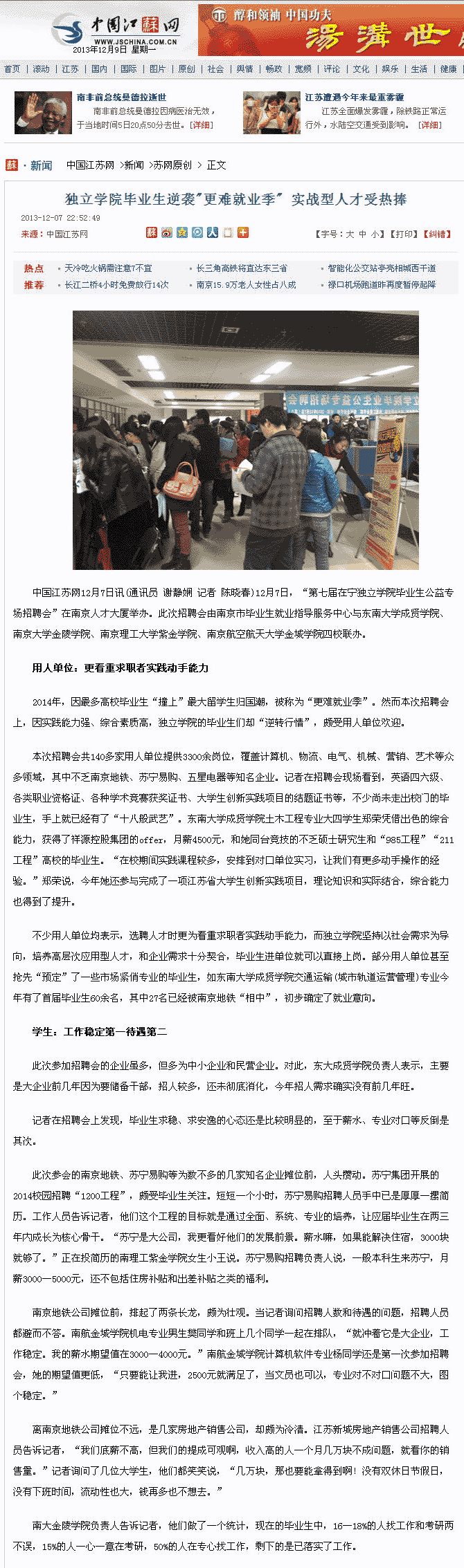 【中国江苏网】独立学院毕业生逆袭“更难就业季” 实战型人才受热捧