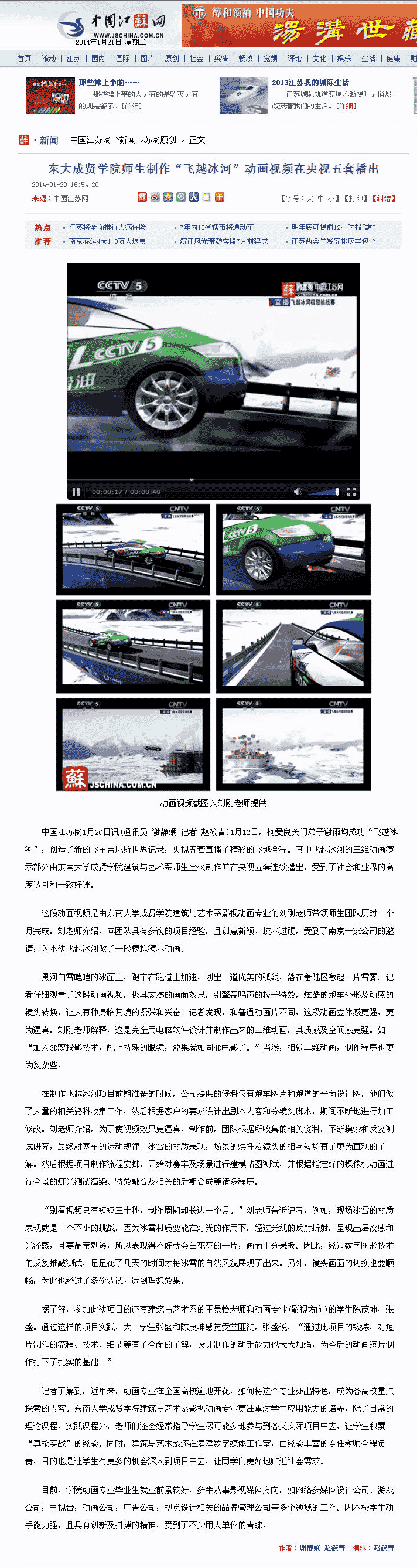 【中国江苏网】东大云鼎国际4118welcome师生制作“飞越冰河”动画视频在央视五套播出