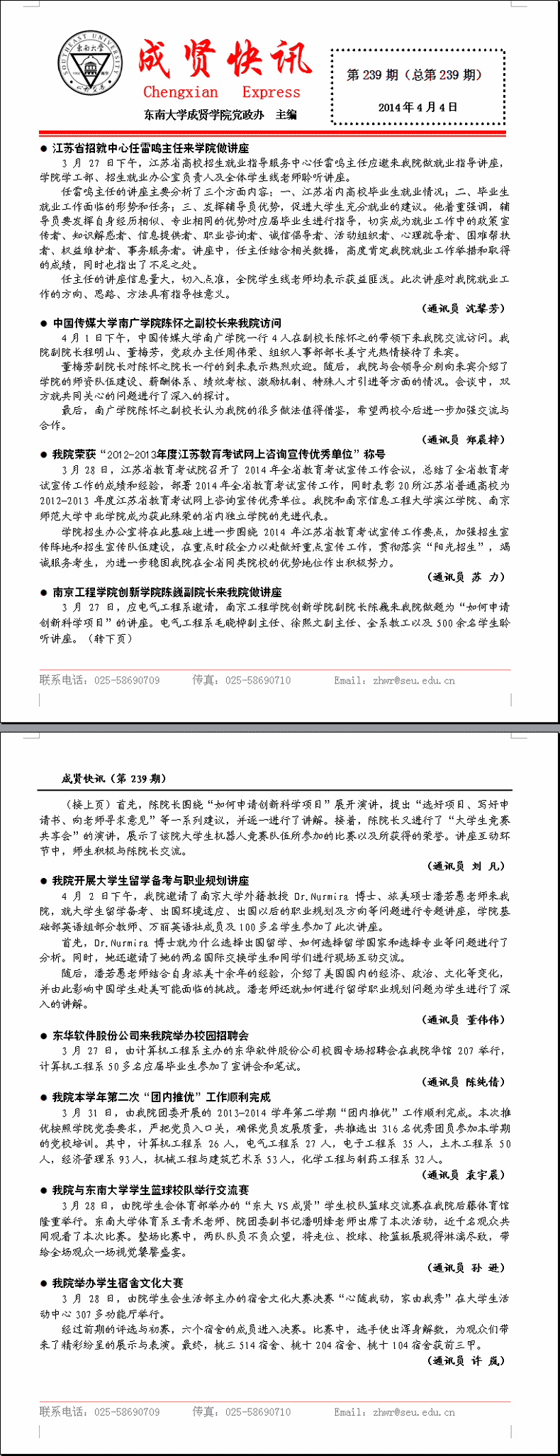 成贤快讯 第239期(总第239期) 2014年04月04日