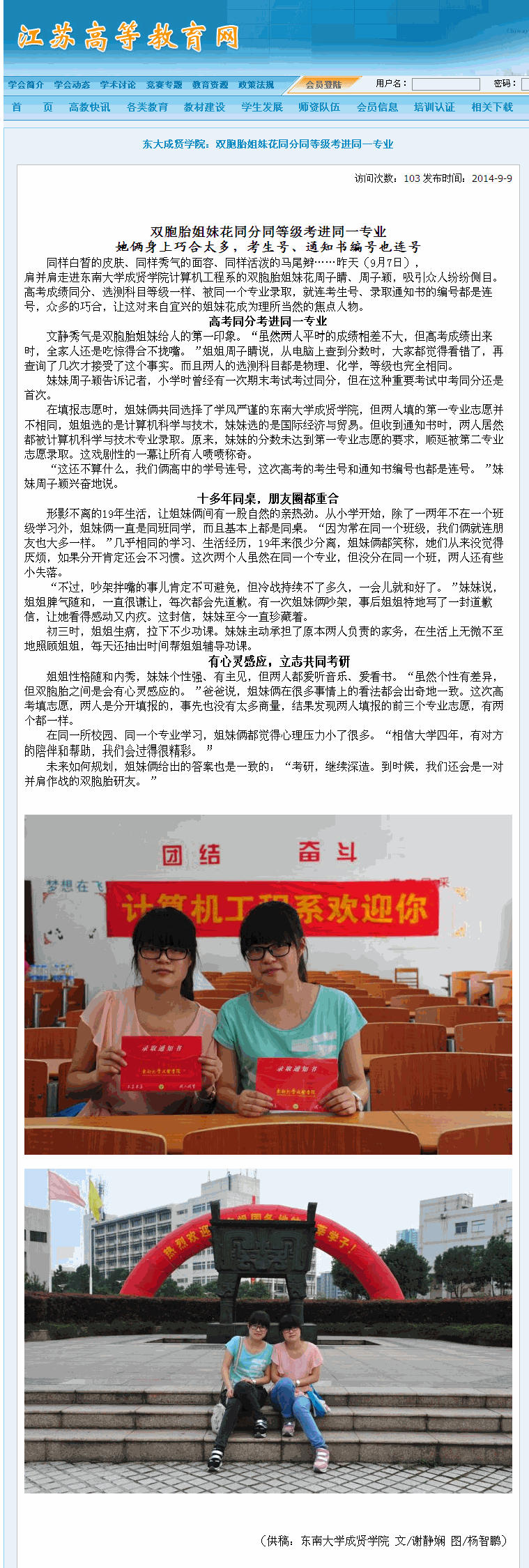 【江苏高等教育网】东大云鼎国际4118welcome:双胞胎姐妹花同分同等级考进同一专业