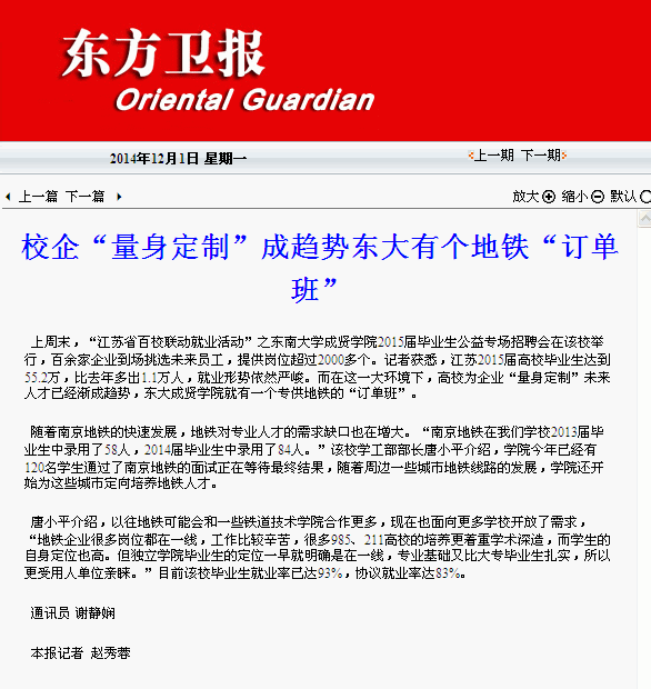 【东方卫报】校企“量身定制”成趋势 东大有个地铁“订单班”