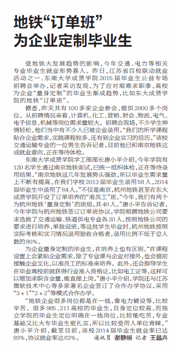 【南京晨报】地铁“订单班” 为企业定制毕业生