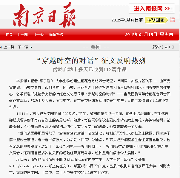 【南京日报】“穿越时空的对话”征文反响热烈