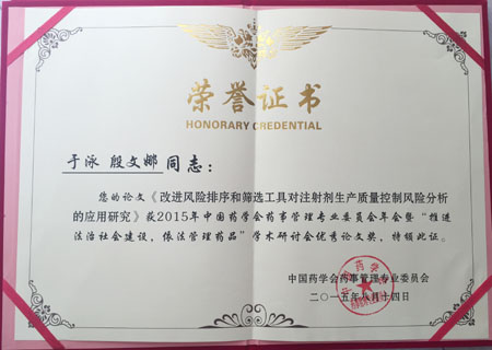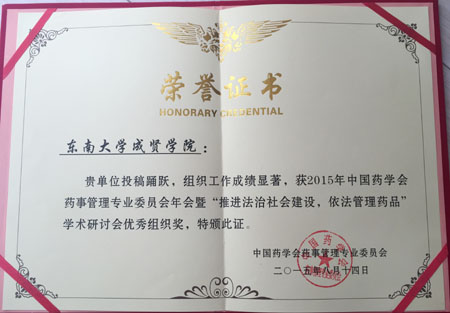 2015年8月13日,中国药学会药事管理专业委员会学术年会在海南海口市隆重举行。我院药事管理专业于泳老师带领学生,向学术年会投稿7篇,均被年会交流论文集收载,其中稿件《改进风险排序和筛选工具对注射剂生产质量控制风险分析的应用研究》获得药事管理专业委员会的优秀论文奖。我院特别荣获“优秀组织奖”。