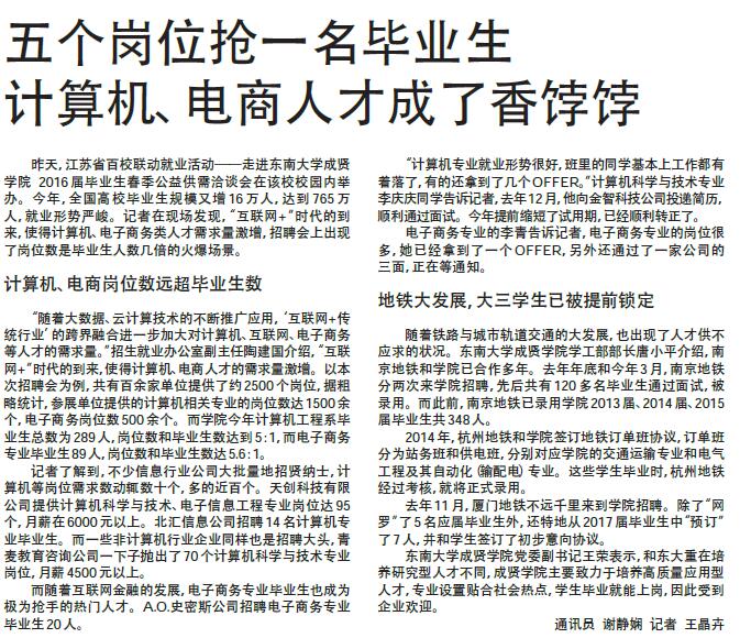 【南京晨报】五个岗位抢一名毕业生 计算机、电商人才成了香饽饽