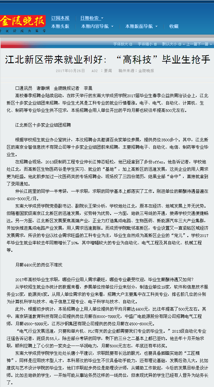 【金陵晚报】江北新区带来就业利好,“高科技”毕业生抢手