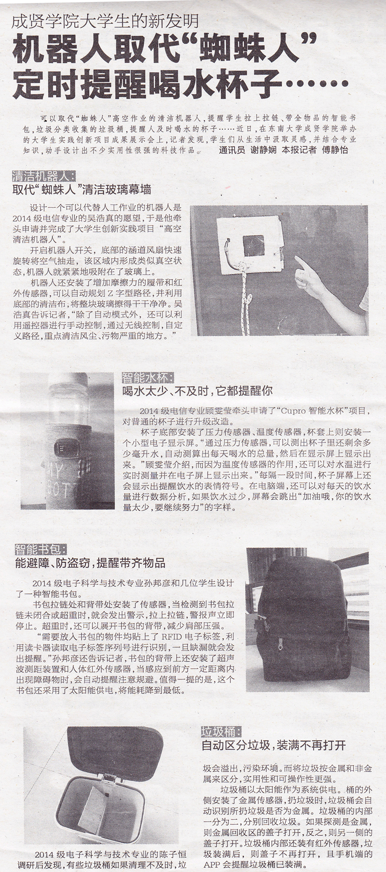 【东方卫报】云鼎国际4118welcome大学生的新发明 机器人取代“蜘蛛人” 定时提醒喝水杯子……