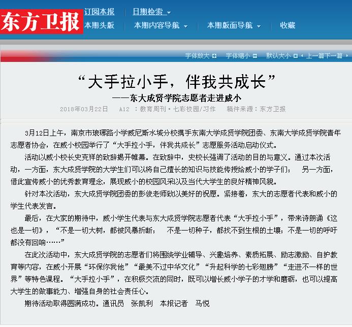 【东方卫报】“大手拉小手,伴我共成长”——东大云鼎国际4118welcome志愿者走进威小