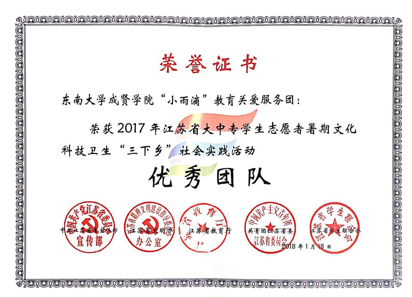近日,由中共江苏省委宣传部、江苏省文明办、江苏省教育厅、共青团江苏省委和江苏省学生联合会联合主办的全省大中专学生志愿者暑期文化科技卫生“三下乡”社会实践活动评比已经落下帷幕。我校团委志工部“小雨滴”教育关爱服务团获评2017年江苏省暑期“三下乡”社会实践活动“优秀团队”。此外,校团委冯杭州老师被评为2017 年江苏省暑期“三下乡”社会实践活动“先进工作者”。