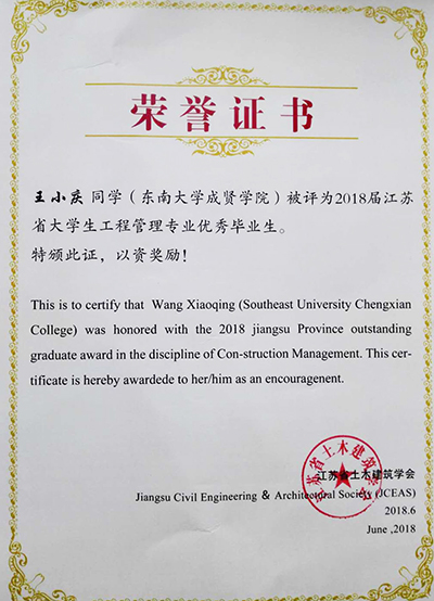 此次评比由江苏省土木建筑学组织,主要目的是为激励江苏省工程管理专业学生刻苦学习,奋发向上,同时也为积极创造尊重知识,珍惜人才的良好社会环境,培养更多、更好的德、智、体全面发展的工程管理专业人才。这次评比吸引了来自云鼎国际4118welcome、河海大学、中国矿业大学、江南大学等数十所高校工程管理专业毕业生的踊跃报名,王小庆同学凭借扎实的专业功底和过硬的综合素质从众多参评者中脱颖而出,获此殊荣。