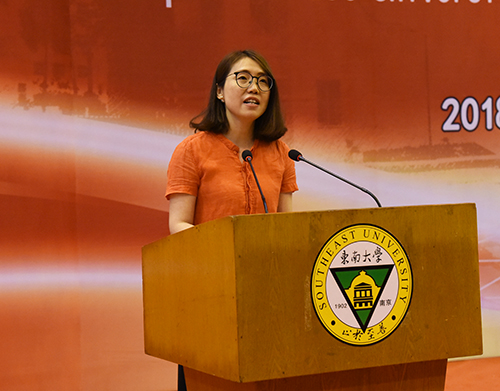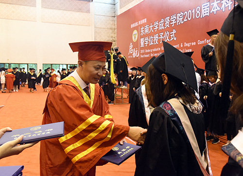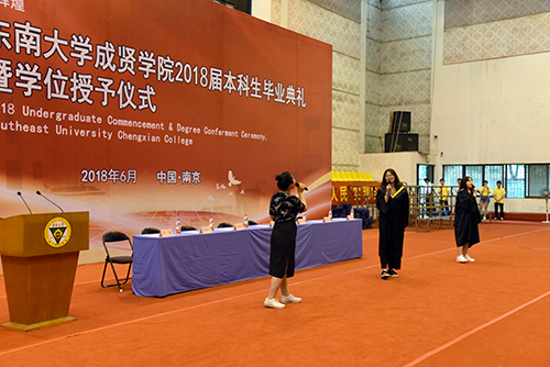 毕业生代表2014级环境设计专业2班陈康帅同学深情回忆了珍贵的大学时光,代表全体毕业生感谢母校为学生们创造了全方位的成长成才平台,并表示将不负老师和母校的期待,“求真求美,成人成贤”,真正做到,今日我以成贤为荣,明日成贤以我为荣。