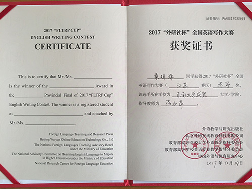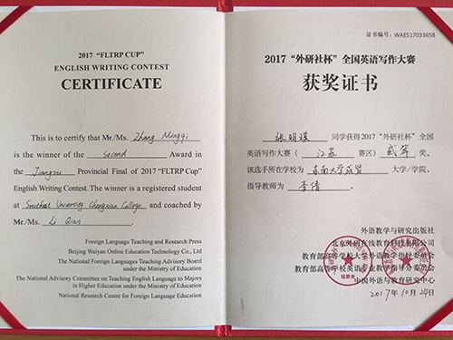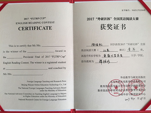 2017年 “外研社杯”全国大学生英语挑战赛江苏赛区比赛于11月4日在常州大学圆满落下帷幕。该挑战赛分为英语写作大赛、英语阅读大赛和英语演讲大赛三部分。我校2014级建筑工程2班陈俊松(指导老师:谭艳珍)在英语阅读大赛中获一等奖,这是目前我校在省级英语阅读比赛中获得的最好成绩。此外,2017级工商管理类2班张明琪(指导老师:李倩)获江苏赛区英语写作大赛二等奖;2017级工商管理类5班龚洁茹(指导老师:朱宇博)、2015级电子商务2班桑明珠(指导老师:燕如萍)获江苏赛区英语写作大赛三等奖。