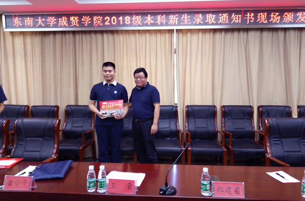 仪式中,郑建勇常务副院长在各中学为新生逐一颁发录取通知书并合影留念。王荣副书记对录取新生表示祝贺,对中学长期以来为我校输送优秀生源以及中学、家长们对学生的辛劳培养表示感谢,同时介绍了我校办学历史、办学理念、学校概况、学科特色、就业考研情况、办学成果等情况,并对录取新生提出希望:一是用中国梦激扬青春梦,在新的起点上规划新的目标,寻找新的梦想;二是学会学习、学会思考,打好做人、做事、做学问的基础,努力学好专业知识,提高服务社会的本领;三是提升社会责任感,做具有家国情怀,能够胸怀天下,敢于担当的人,并表示学校将营造更好的校园环境和氛围欢迎新生的到来。