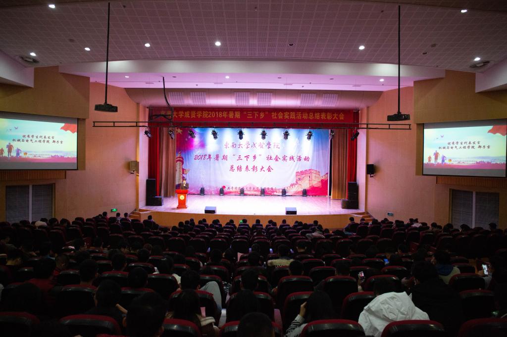 11月20日晚,由校团委主办、志愿者工作部承办的2018年暑期“三下乡”社会实践活动总结表彰大会在综合楼报告厅313举行。学生处处长唐小平老师、校团委书记潘明烽老师、学生处副处长苏力老师以及各院分团委书记和各优秀团队的指导老师们、成员代表及2018级团支部代表近500人参加了大会。