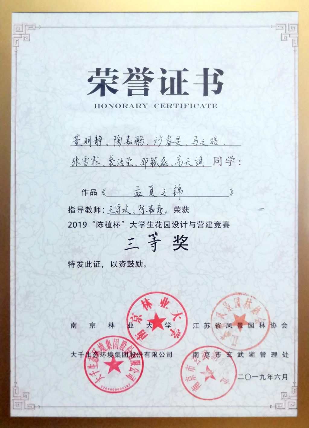 近日,2019“陈植杯”大学生花园设计与营建竞赛在南京市玄武湖公园成功举办。经过为期一个多月的构思设计、方案评选、现场施工、专家评审,建筑与艺术设计学院风景园林专业董明静、高天旗等8位学生组成的团队所设计和营建的小花园作品在玄武湖畔落地建成并获得三等奖。