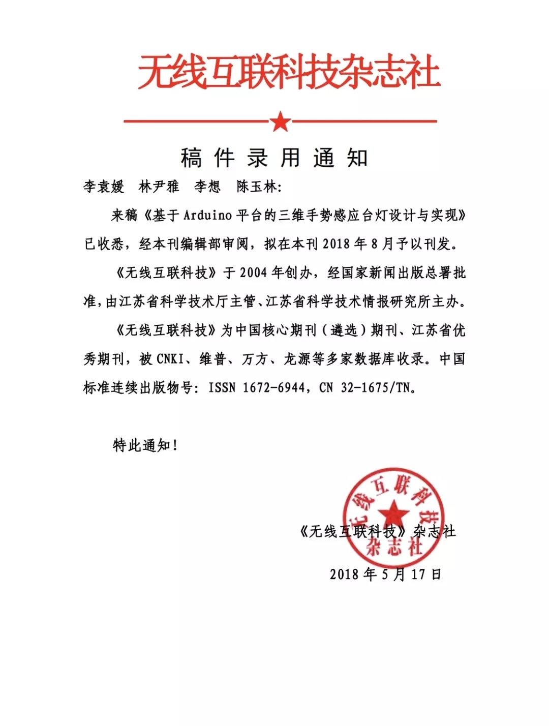 林尹雅向记者展示了台灯的使用方法,在灯座和灯头之间,用手左右挥动,台灯可以开启和熄灭。上下挥动,则可以切换黄色和白色灯源。林尹雅解释,台灯上安装了红外模块,可以敏感地“感应”到动作,实现开关和光源切换。同时,在灯头上安装了超声波模块,手越接近灯头,灯光就会越暗,手远离灯头,灯光就会变亮。很快,她便申请了《基于Arduino平台的三维手势感应台灯及其感应控制方法》(国家发明专利号201810289641.1)的发明专利。