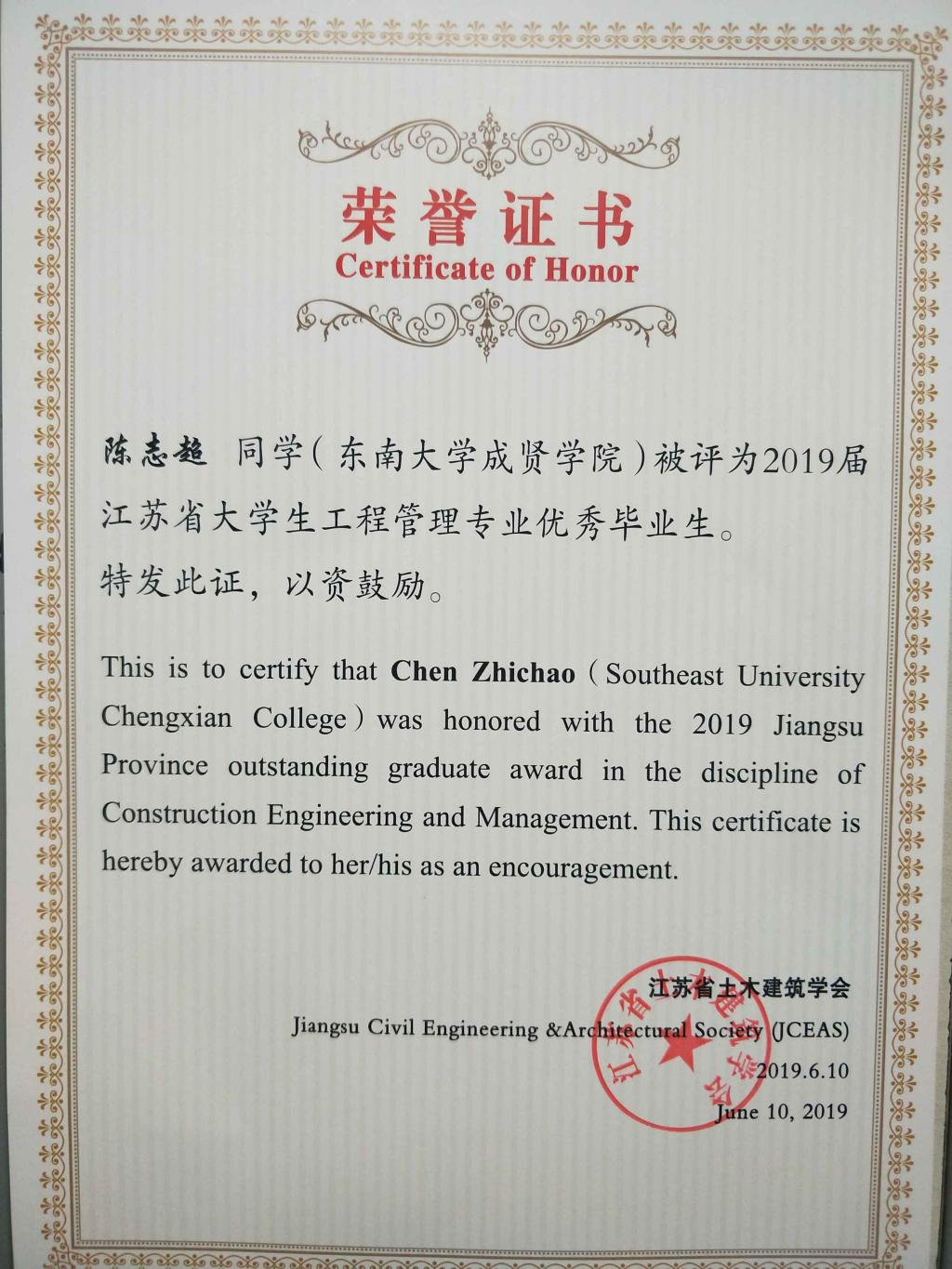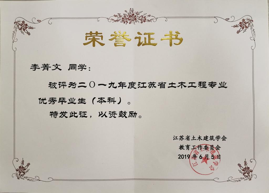 近日,从中国土木工程学会教育工作委员会江苏分会和江苏省土木建筑学会传来喜讯,云鼎国际4118welcome土木与交通工程学院2019届毕业生李菁文荣获江苏省土木工程专业优秀毕业生,陈志超荣获江苏省工程管理专业优秀毕业生。