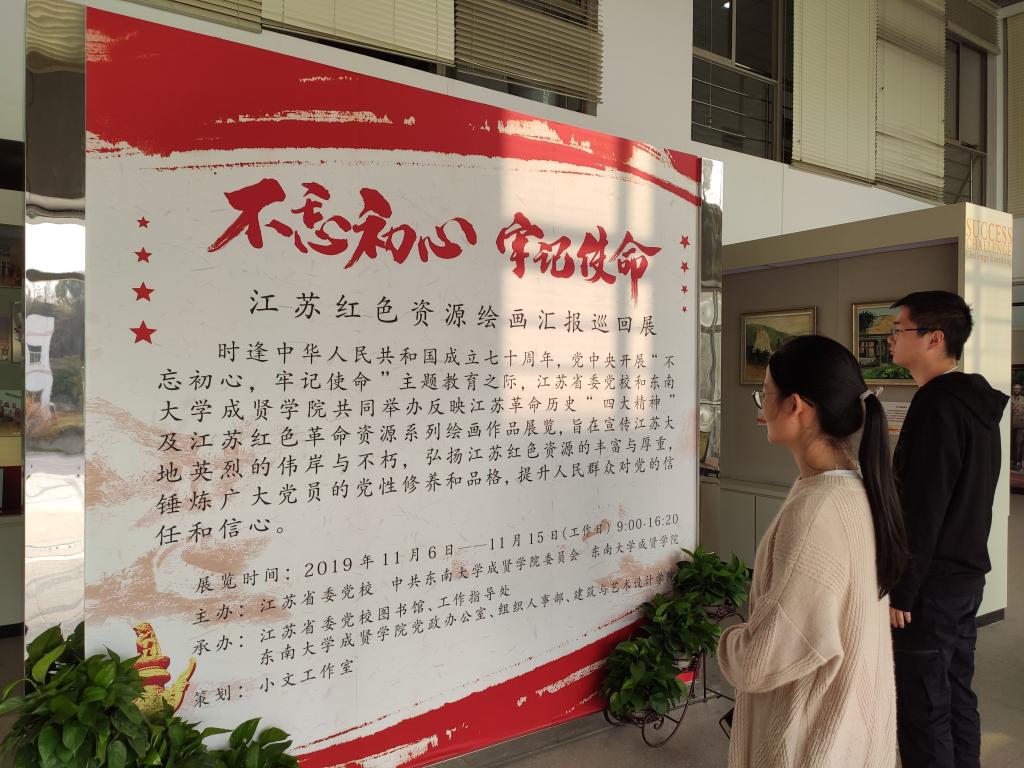 为庆祝中华人民共和国成立七十周年,进一步推进“不忘初心、牢记使命”主题教育,11月6日—15日,云鼎国际4118welcome与江苏省委党校在电工电子实验大楼二楼展厅共同举办了反映江苏革命历史“四大精神”和江苏红色资源绘画汇报巡回展。