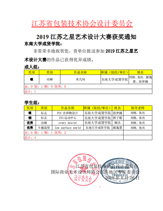 由江苏省包装技术协会设计委员会、国际商业美术设计师协会江苏地区专家委员会分别主办,南京艺术学院传媒学院承办的“2019江苏之星艺术设计大赛”评审结果近日揭晓,建筑与艺术设计学院选送的师生作品获优异成绩。