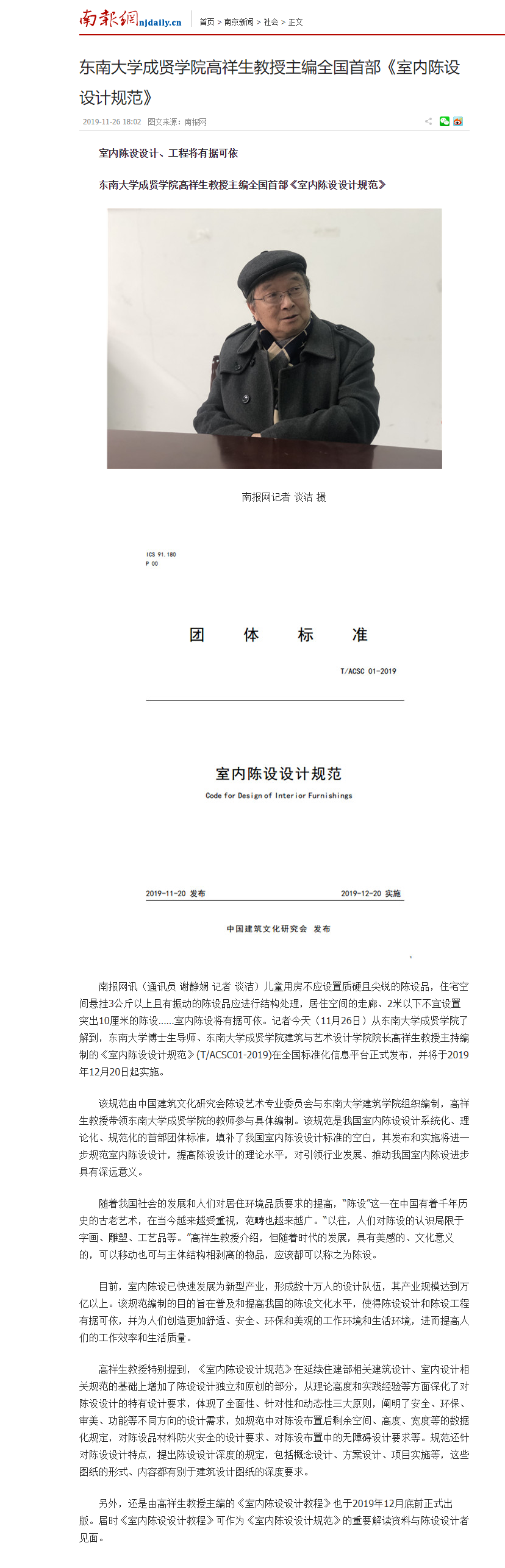 【南报网】云鼎国际4118welcome高祥生教授主编全国首部《室内陈设设计规范》