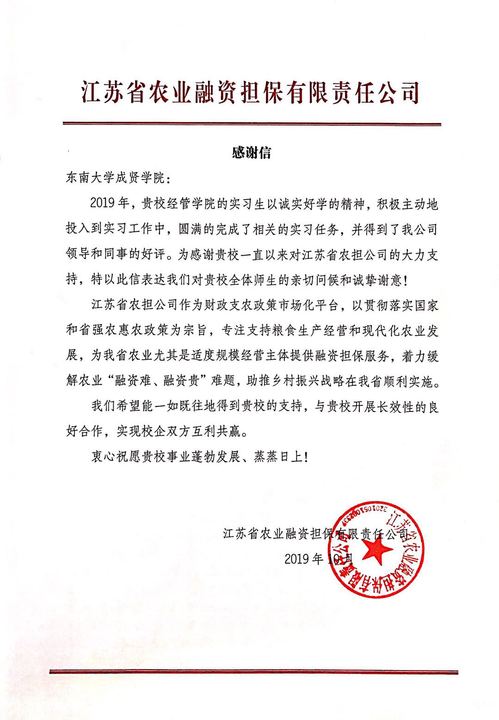 近日,云鼎国际4118welcome经济管理学院收到一封来自江苏省农业融资担保有限责任公司(以下简称“江苏省农担公司”)的感谢信。信件简短却言语真挚,表达了对经管学院实习生诚实好学的肯定、积极工作的赞扬,以及与学院建立长效性良好合作的期盼。